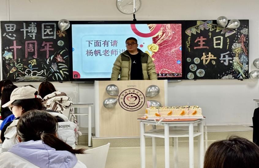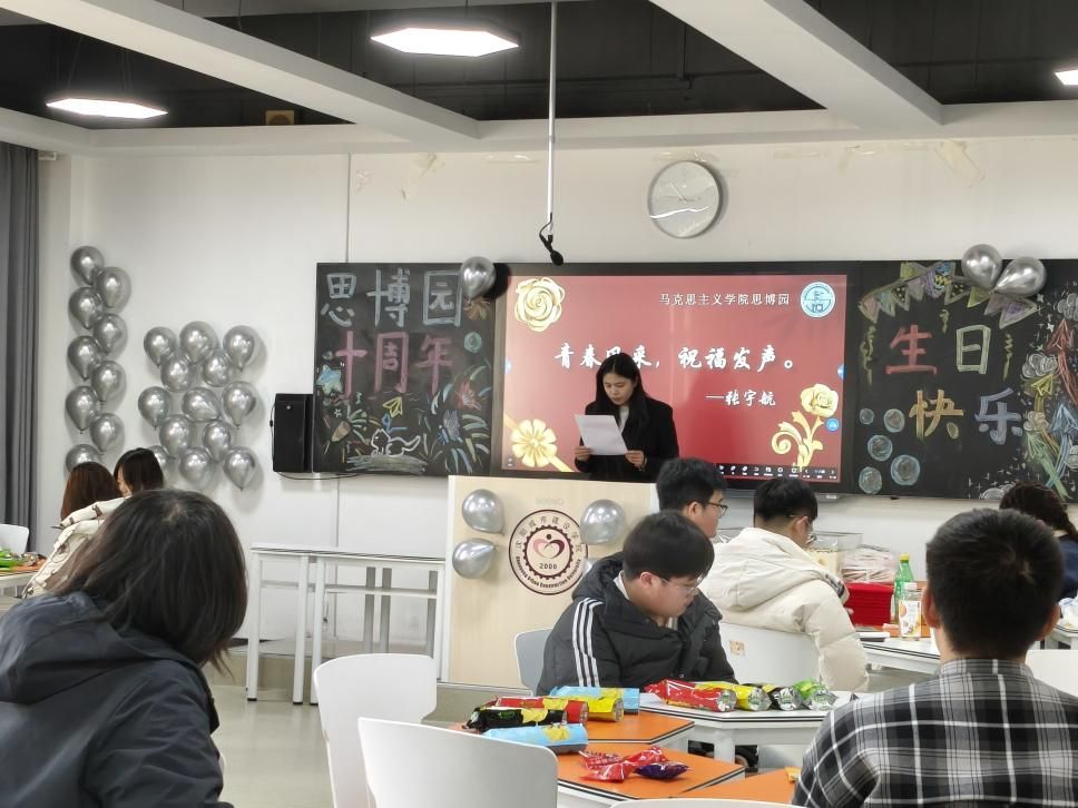 随后,马克思主义学院院长助理杨帆在致辞中表示:今天是思博园十岁的生日,站在这里满是感慨。十年前,它只是一颗刚刚破土的思想的幼苗,如今已成为大家碰撞观点、探索热爱的繁茂花园。十年不是终点,而是新起点。希望你们继续带着热情与真诚在这里成长,在更广阔的天地里发光发热!最后,祝“思博园”十岁快乐,也愿每个在这里的同学,都能带着思考的力量奔赴人生的星辰大海!