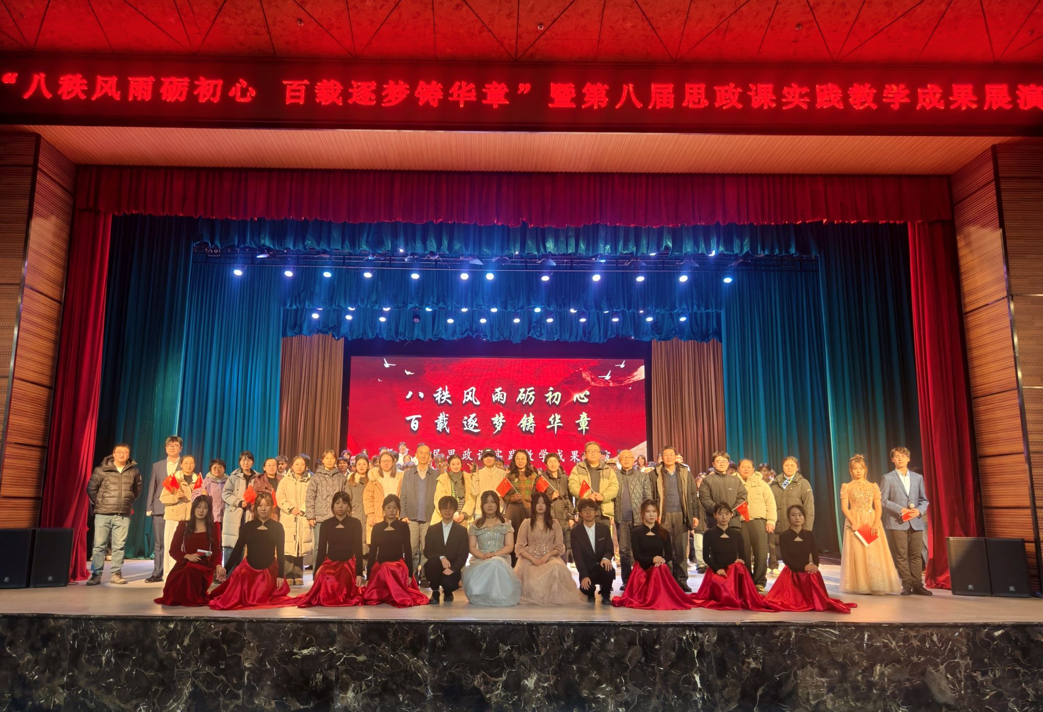 在纪念中国人民抗日战争暨世界反法西斯战争胜利80周年的重要节点,为深入学习贯彻党的二十大和二十届历次全会精神,12月4日,马克思主义学院在音乐厅举办第八届思政课实践教学成果展演。本次展演以“八秩风雨砺初心百载逐梦铸华章”为主题,创新融合实践教学、历史纪念与艺术展演,为500余名师生呈现了一堂立意深远、形式生动的场馆思政大课。